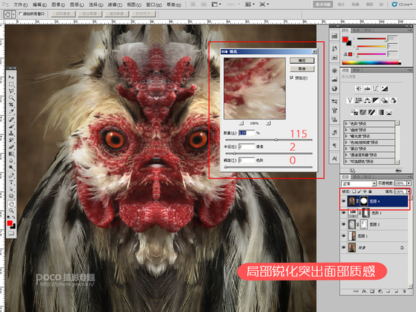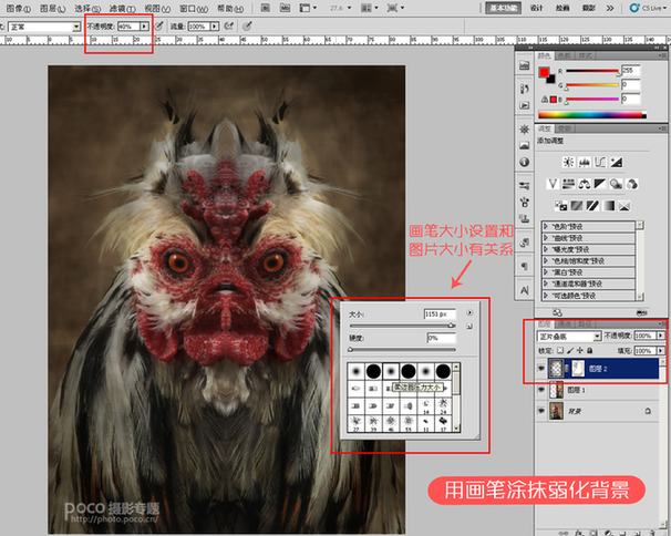 为了能更好的表现主题,我常用的方法就是削弱主题外其他东西,比如背景。这里先新建一个图层,将图层混合模式设成“正片叠底”,然后使用画笔工具“B”,前景色设成黑色,透明度40%,在图层中想要遮盖的部位涂抹,注意别涂抹鸡的脸部。如有不慎涂过不想弱化的地方可以在蒙版中擦去。
