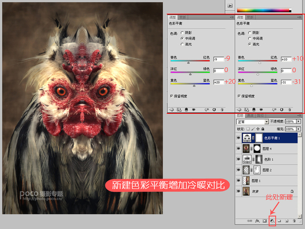 最后加强冷暖对比,其实这也是加强画面对比度的一种方法。创建一个色彩平衡图层,将高光向暖色方向调整,中间调向冷色方向调整,具体参数看个人喜好。