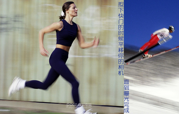 把快门定在1/10或1/20秒,调整合适曝光,不断半按快门自动对焦,或快速手动对焦,或用预先对焦等方法,总之对准你要拍摄的运动中的物体,如汽车或人跑步,按下快门的时候平移你的相机,直到曝光完成。