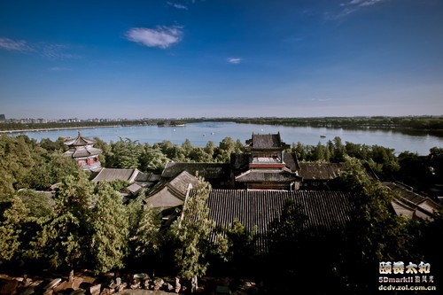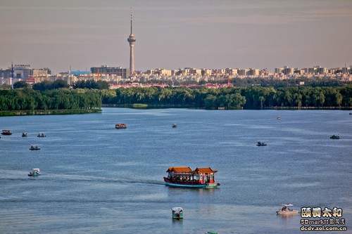 既然长焦镜头可以给人一种强烈的压缩感,如我们看到的这张照片一样。昆明湖、岸上的树、远处的中央电视塔,三者被压缩到同一个画面中。如何能让画面不显得凌乱,那么还是需要有个统一的构图安排。