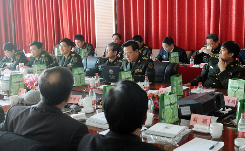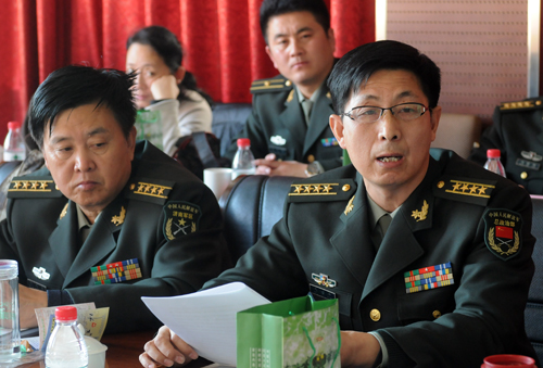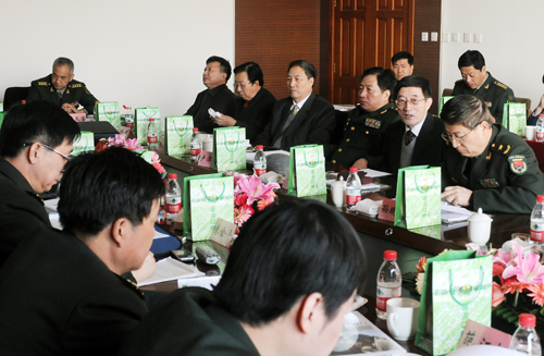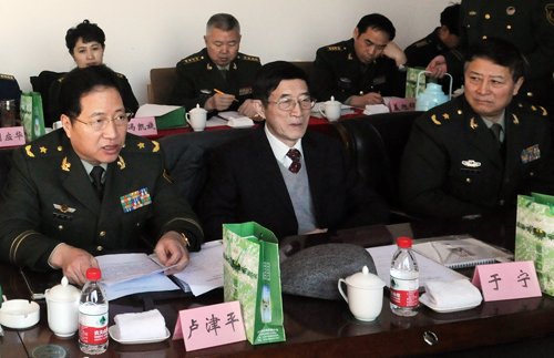 1212,武警政治部副主任卢津平将军(前左一)在军事摄影联络部第一次工作会上致欢迎辞。