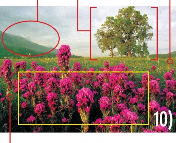 远处的山形交代了一些环境和细节 右侧的树木与前景的花丛形成鲜明的视觉关系 中间的草地在画面中占据的部分最小