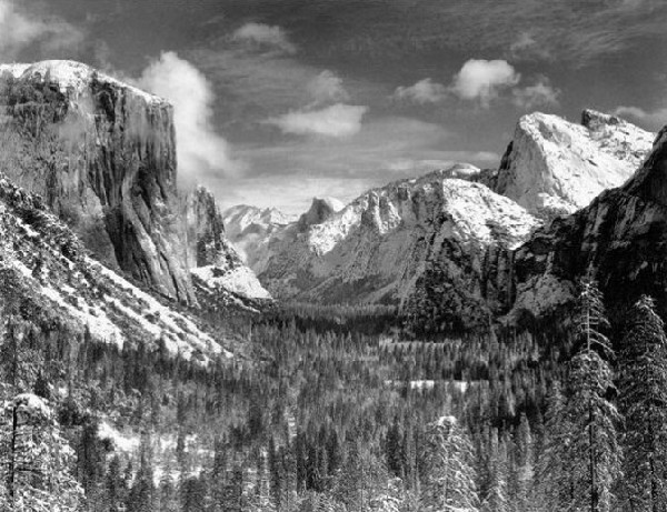 《冬天的风暴》是亚当斯1940年拍摄于约塞米蒂国家公园的一幅作品。那是12月初的一天。风暴最初夹杂着大雨,后来雨又变成了雪,直到中午天气才开始变得清澈。亚当斯驱车来到一个新找到的能够激起创作灵感的拍摄点,站在这里能看到约塞米蒂峡谷迷人的景色。他立即架起了8×10相机,装上121/4英寸的柯达XV镜头,对山坡和画面底部进行了取舍构图。然后等待云彩在画面上部形成动人的形状。为了避免云彩移动时造成影像模糊,曝光对问要求很短。
