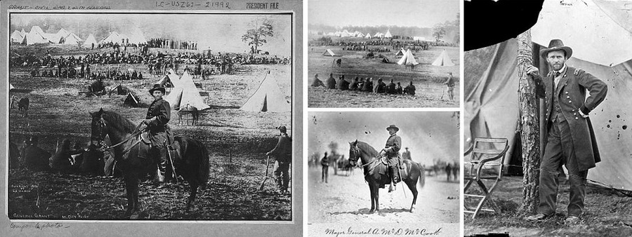 左侧美国第18任总统尤利西斯 S 格兰特当将军时骑马的假照片是用右侧三张照片合成的。