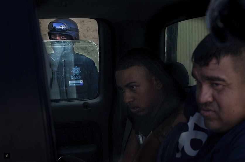 2010年05月19日,在奇瓦瓦州华雷斯城,两个嫌疑杀手被押送上车,一名全副武装墨西哥联邦警察在旁看守。