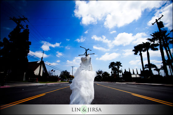 将概念上对立的东西放在一起拍摄,会营造强烈的效果,也让照片变得有趣。例如上图在广阔的户外空间,放置理应是室内陈列的漂亮婚纱;又或是下图,洁白纯真的新人与婚纱,对比墙上的街头涂鸦,也让照片更加耐人寻味。
