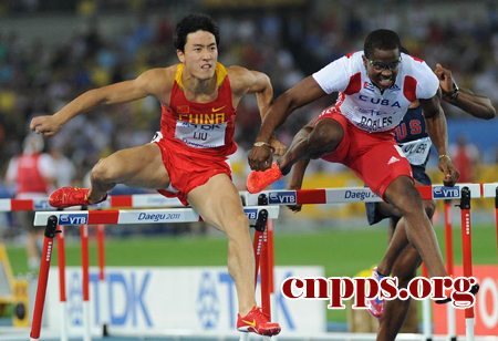 ????8月29日,中国选手刘翔(左)在决赛中遭遇古巴选手罗伯斯手臂拉拽。当日,在2011世界田径锦标赛男子110米栏决赛中,罗伯斯因犯规被取消成绩,丢掉到手的金牌,刘翔从铜牌晋升银牌。(第22届中国新闻奖摄影作品初评入围作品)
