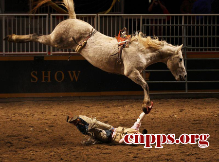 ????2011年11月6日,在加拿大国家展览中心,选手汤米·梅杰在比赛中落马。当日,2011年加拿大皇家冬季农业博览会上的牛仔骑术竞技赛在加拿大国家展览中心举行。比赛共设有无鞍马骑术竞技、绕杆竞速、有鞍马骑术竞技、绕桶竞速等项目,来自加拿大东、西部地区的近50名男、女参赛选手为观众尽情展现了骑手在马背上的风采。(第22届中国新闻奖摄影作品初评入围作品)