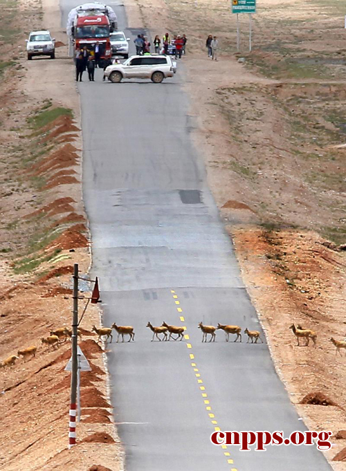 ????2011年7月27日,远处的乌云刚刚散去,迁徙的藏羚羊就急忙排队穿过可可西里青藏公路。可可西里五道梁?;ふ菊境じ侣瓴诺┖椭驹刚呙窃谡饫锸鼗だ钩滴亓缪蛲ü嗖毓繁<莼ず?。(第22届中国新闻奖摄影作品初评入围作品)
