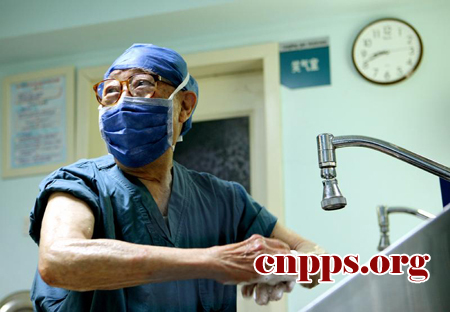 ????8时44分,吴孟超在手术室门外洗手,不紧不慢,不急不躁,极其认真。他说:“认真洗手才能杜绝或减少病人感染,这是外科医生的基本准则”。