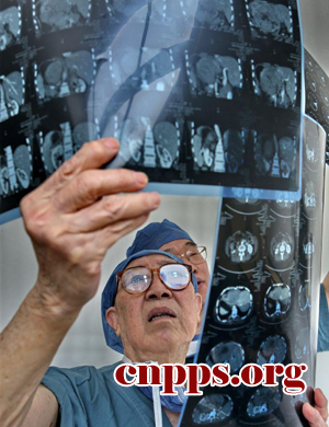 ????11时05分,做完两台手术,吴孟超不显疲惫,精神愉悦。他不急于离开手术室,而是习惯于到弟子们的手术室去看一看,像将军检阅部队。