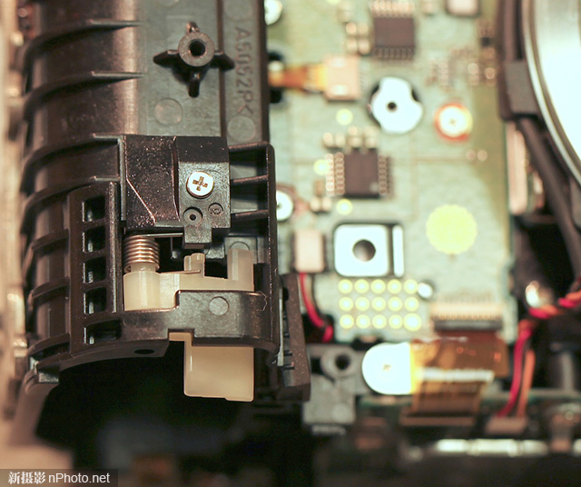 回到相机后面。覆盖的塑料胶布很容易揭起,同时Roger也发现了松动的螺丝——由于内部有良好的?;?,所以它没有到处乱跑,损坏其他地方。