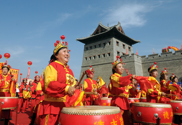 图为身着古装的威风锣鼓队为中国(大同)国际汽车文化节开幕添彩助阵。?王呈选摄影报道