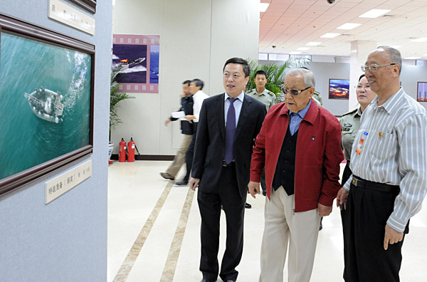 ??? 中央军委原副主席迟浩田(中)和北京易和中健文化传播有限公司经理吴峰(左一),及冷宽中将(右一)等参观展览。