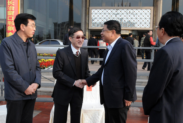 山西省长治市市长张保(右二)与参会代表合影后同中国新闻摄影学会主席于宁(左二)交谈。