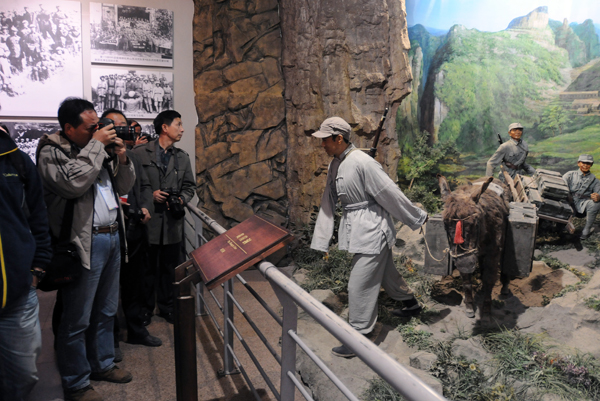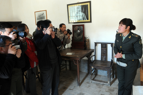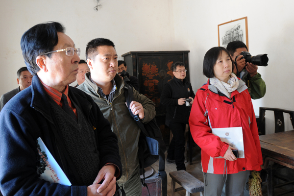 新华社摄影部副主任丁玫(右二)等与会代表一同参观武乡县砖壁村八路军总部太行旧址左权将军办公室。
