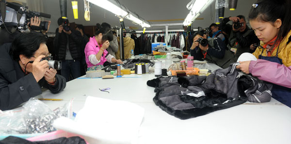 嘉宾们正在中国裘皮城裘皮加工点拍摄制作裘皮服装过程。