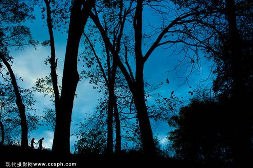 如上图,通过使用广角镜头,就能在画面制造出新人与树林之间的体型对比,照片也会更震撼。
