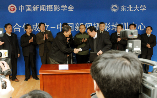 中国新闻摄影学会执行主席赵德润(左)、东北大学继续教育学院院长卢俊杰分别签署合作签约。