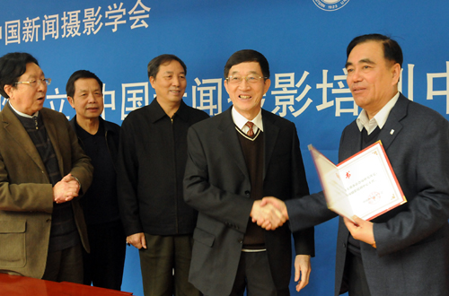 中国新闻摄影学会主席于宁(右二)为中国新闻摄影培训中心主任刘杰敏颁发聘书。
