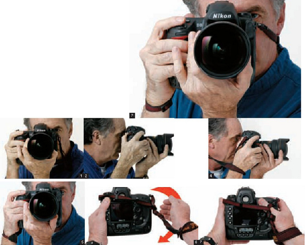 1~2. 手肘贴在胸部,让相机稳固地靠在前额。用右手握住相机,除了食指保持灵活外,所有的手指都握住相机。右手掌承受相机大部分的重量,手腕在相机正下方保持垂直??糇远越梗褂米笫值拇竽粗?、中指和无名指操作变焦环。左手的食指用来拖住镜头,小指叠放在右手握住镜头的手指上以增加额外的支撑。