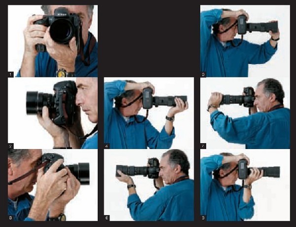 6~7. 这是4~5握法的变形,也是我最喜欢的握法。由于左肘仍是悬空的,因此使用握住镜头前方的方式可以更为稳固和自然。使用长焦镜头,握住镜头的中后端8. 左手拖住镜头中后部并承担相机重量是更为常见的握法,此时左前臂呈垂直状态并贴近身体。尽管不太灵活,但如果手动对焦镜头或手动镜头时,可以作为一种可选的手持方式。