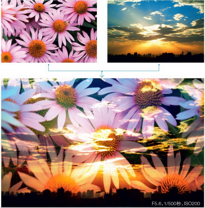 多重曝光这一技法,是一种实现想法的表现方式,是一种创意;所以在科学技术这么发达今天,从技术上能够让我们轻松拍摄多重曝光作品,但在意识上,还是要有创意,有意识的安排画面,这对得到一张成功的作品来说很重要,如右图,这幅多重曝光影像在画面安排上,我把小太阳花和夕阳下的城市景色相结合,因为城市场景的天空较空旷,而太阳花正好填补了这个空白,与夕阳的光线重叠让太阳花更富有生机,色调温暖且饱和,使整幅多重曝光的画面色彩漂亮,丰富却不凌乱,这就是有意识地安排画面。