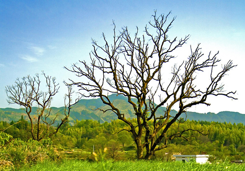 粗壮的树干跟深色的草地放在下方,而且左右也有一大一小的树木来平衡画面 Photo by Chi King