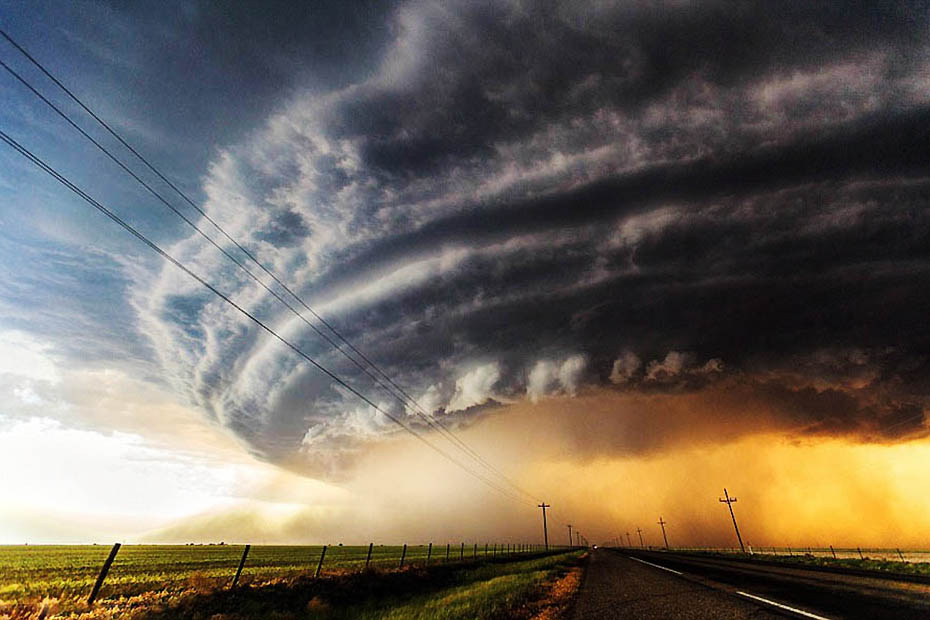 英国《每日邮电》9月11日在报道中描述了这样一幕:在辽阔的草原和寂静的公路上方,巨大的乌云层正在空中集结形成,仿佛一架太空飞船盘旋在大地的上方。世间的一切都在静候毁灭的序幕。这一幕就是超级雷雨胞形成时的景象?!睹咳沼实纭房堑囊蛔橥计?,清晰地展现了超级雷雨胞在美国“龙卷风走廊”(Tornado Alley)形成时的骇人景象。图片来源:环球网