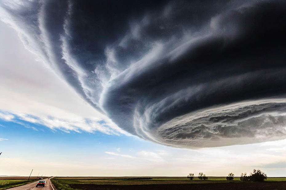 英国《每日邮电》9月11日在报道中描述了这样一幕:在辽阔的草原和寂静的公路上方,巨大的乌云层正在空中集结形成,仿佛一架太空飞船盘旋在大地的上方。世间的一切都在静候毁灭的序幕。这一幕就是超级雷雨胞形成时的景象。《每日邮电》刊登的一组图片,清晰地展现了超级雷雨胞在美国“龙卷风走廊”(Tornado Alley)形成时的骇人景象。图片来源:环球网