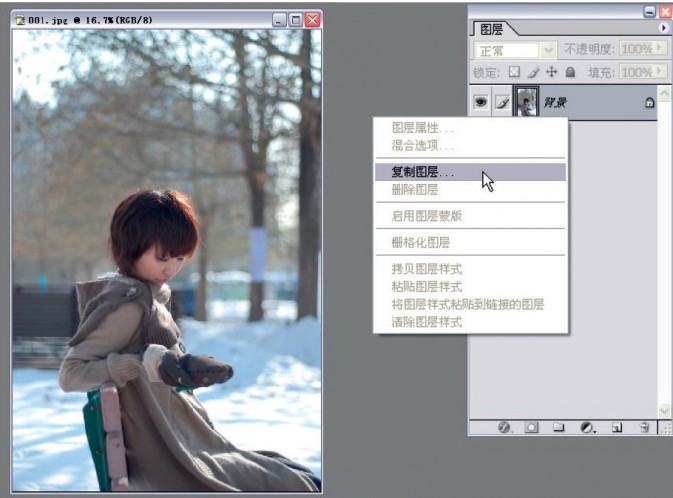 1.为了方便后面的操作,我们要在图层窗口中增加新的图层,在新的复制图层中进行调色操作。保留一张原始照片的图层,方便我们返回到初始状态。点击鼠标右键,出现弹出框。再将鼠标移动到“复制图层”的位置,单击鼠标,就可以复制背景图层了。