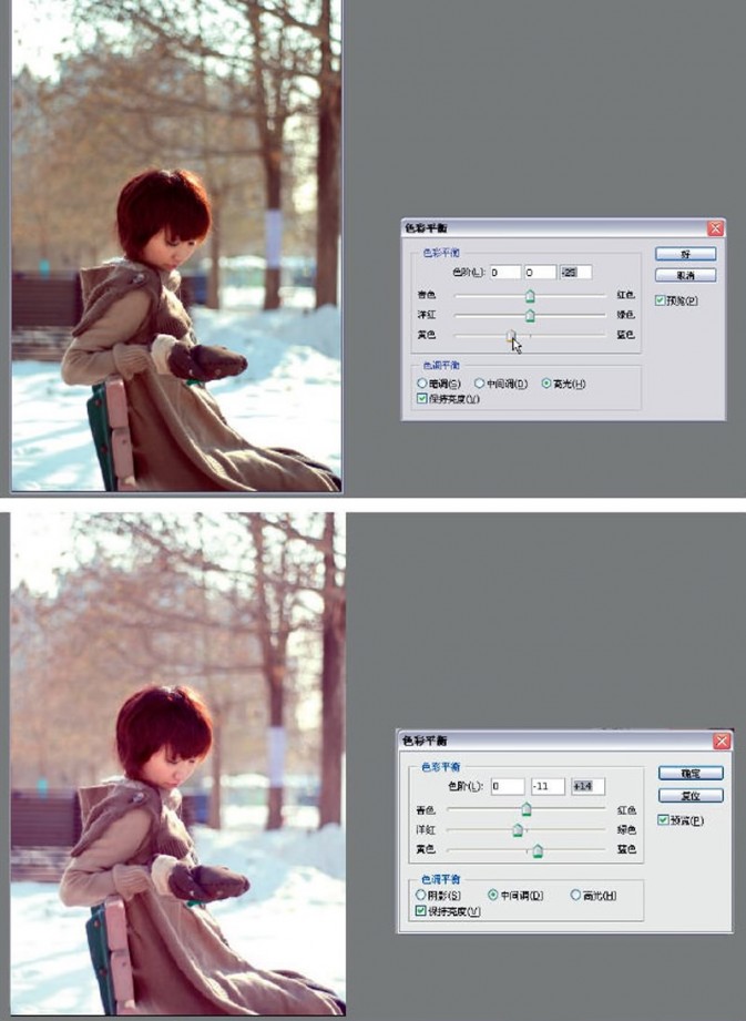 完成上面操作后再选择“高光”选项,选择“黄色”和“蓝色”的色彩区域进行处理,将光标向黄色部分移动?;蚪撞糠值氖档髡?25。这样操作能使照片中的高光部分增加一些黄色。最后,我们选择中间调的处理,稍稍增加一些作品的“洋红”色和“蓝色”,让作品偏紫一些。