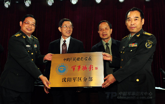 中国新闻摄影学会主席于宁、副主席江志顺向沈阳军区宣传部授“中国新闻摄影学会军事摄影部沈阳军区分部”牌匾。