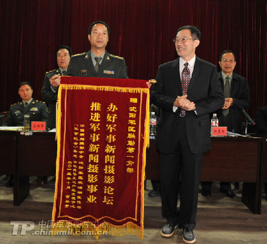 中国新闻摄影学会主席于宁向沈阳军区联勤部第一分部颁发奖旗。赵佳庆摄