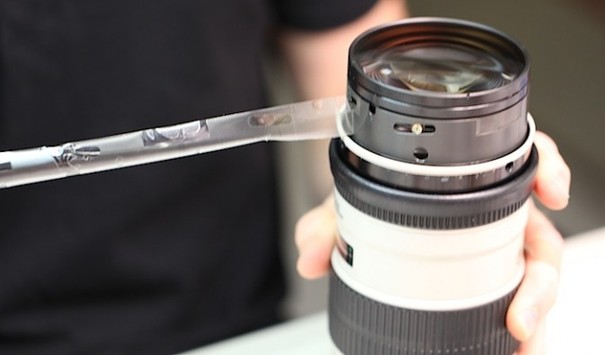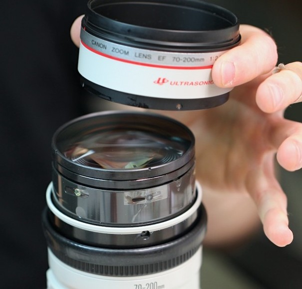 要拆除前镜组,必须先移除镜头前端的滤镜环。反折对焦环橡胶,露出隐藏在下面的固定螺丝。