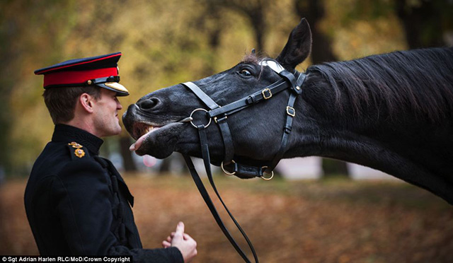 吻别,摄影师:中士Adrian Harlen RLC,该作品获得了Portfolio专业组的亚军。Thomas是一匹22岁的阉马,其也是骑兵团最老的马之一。图为老马在退役前,与28岁的骑兵团团长,上尉Charlie Fitzroy吻别时的场面。