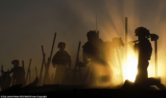 落日下的士兵,摄影师:下士Jamie Peters RLC,该作品获得了图像处理专业组的冠军。落日余晖下,21工程师团的工兵们正在Nahidullah巡逻基地拆卸一幢名为Hesco堡垒建筑。