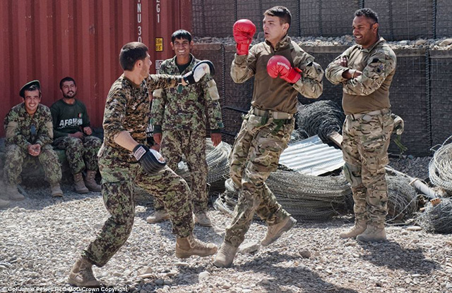 打破壁垒,摄影师:下士Jamie Peters RLC。来自1SCOTS部队的士兵们正在与他们的阿富汗同事切磋拳法。