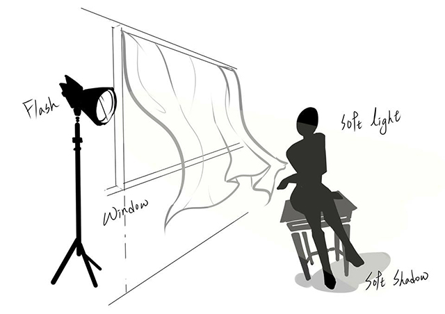 将白布盖在窗户上来柔光的概念图。