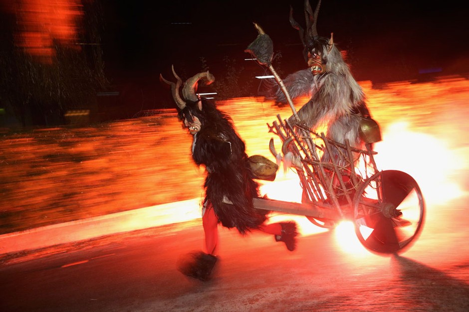 “Krampus”是巴伐利亚地区和阿尔卑斯山其他一些地区的传统活动,每年12月前后举行。Krampus是圣诞老人的原型——圣人尼古拉斯的助手,在当地的传说中,他肩背一个装着礼物的大袋子,手拿一根棍子,好孩子可以收到他的礼物,顽皮的孩子则会被棍子敲打?!癒rampus”的造型有些让人吐槽,看起来如同“恶魔”一样凶残,其实面冷心热??纯此氖芑队潭?,你就知道他的人气有多旺。