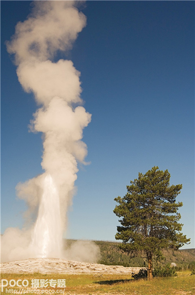 蓝色天空勾勒出老忠实泉每隔90分钟喷射而出的蒸汽和水柱的轮廓。