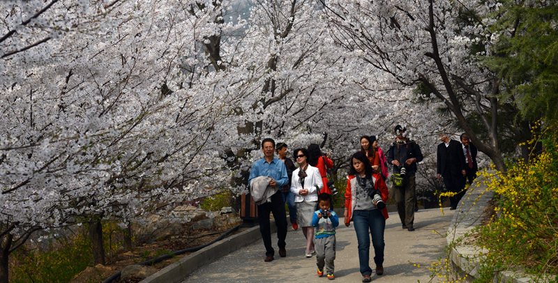 ????各地游客漫步万株樱花山。