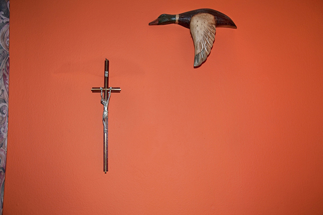 挂在墙上的耶稣受难像以及鸭子装饰物