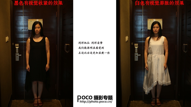 一、服装造型  如果有四套裙子,颜色分别为黑色、白色、灰色、碎花。作为摄影师,你会建议一个没那么瘦的妹纸穿哪一身呢?别犹豫,选黑色!除非其他颜色的服装能100%衬托出妹纸超群的气质或者让妹纸看起来只有80斤,不然就别考虑了。因为黑色有视觉收紧的效果,能让妹纸看起来更瘦,所以黑色绝对是首选哦!