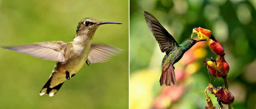 一、凝固高速动作  要凝固到高速的动作,手段就是“高速快门”(或可用闪光灯,但那是另一个故事),然而有些动作是极为快速,例如上图两只都是蜂鸟 (每秒可拍翅膀达80次),第一张是以1/1000秒快门拍摄,但依然看到翅膀的动态模糊,而第二张则用上 1/8000秒超高速快门来拍摄,才可以凝固到动作。但在如此高速快门下,即使是阳光充沛而光圈也达到f/2.8,仍必须推高ISO至1000才足以达到适当曝光。假如你所用的镜头光圈更小的话,那么ISO就必须要更高,才足以维持高速快门了。