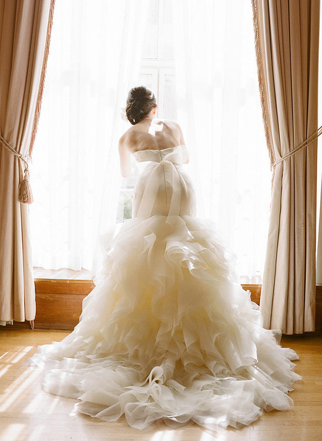 新娘好奇地往窗外看,从后方捕捉背影,裙子的摺边裙摆。