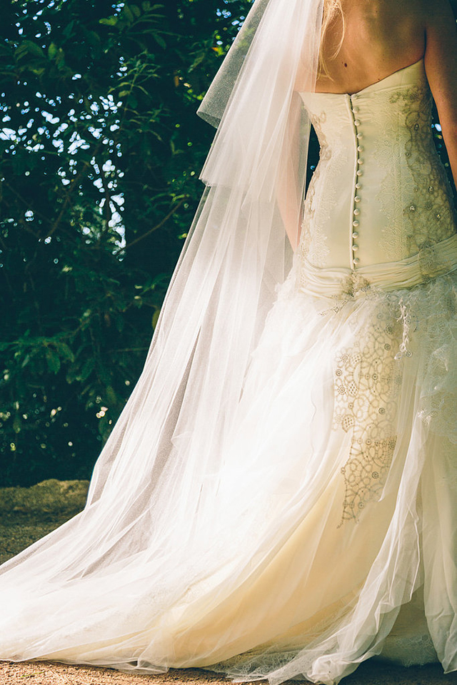 经典的一排钮扣是一件华丽婚纱的细节。为了捕捉它的美,可以将头纱稍稍偏向一侧,避免遮盖到钮扣,微侧身照一张吧。
