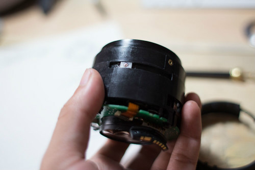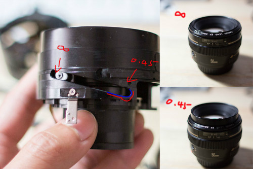 ↓这里一般就是问题所在了,前镜组沿着滑道在镜筒里面移动,无限远的时候在最上面,不过这时候前组是完全缩进镜身的;最近合焦(这只头是0.45m)的时候在最下面,这里的金属很薄,而且这时候前组是突出的,如果受到的外力比较大,就容易造成滑道变形,从而影响对焦。
