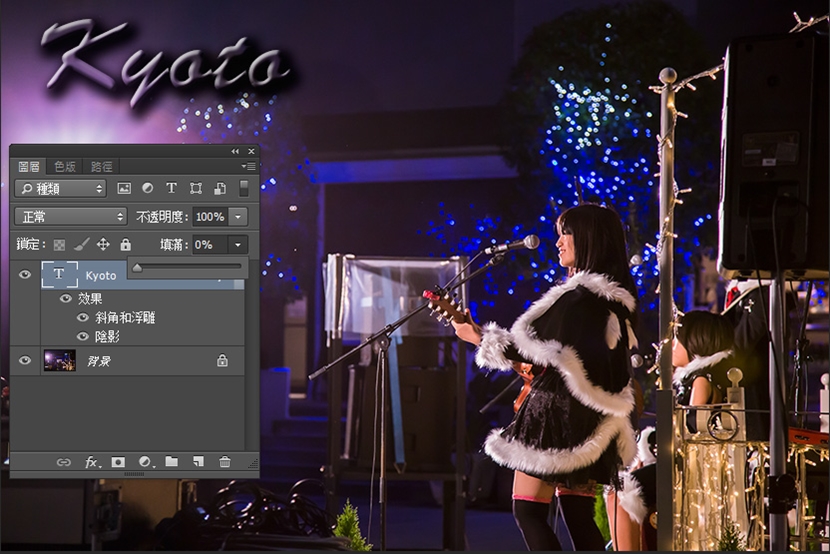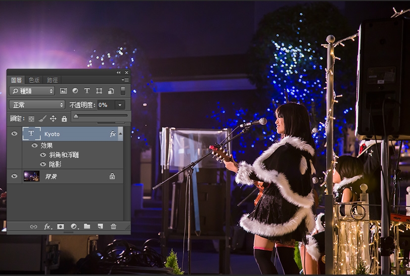 (一) 不透明度 (Opacity) vs 填充 (Fill)  两者最重要的分别,在于不透明度会改变整个图层的透明度,而填充则会保留图层样式(layer style)。下图的底图和文字是分别的两个图层,如果如下图一样,把文字的不透明度降至0,则整个文字消失了。