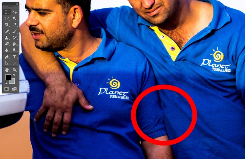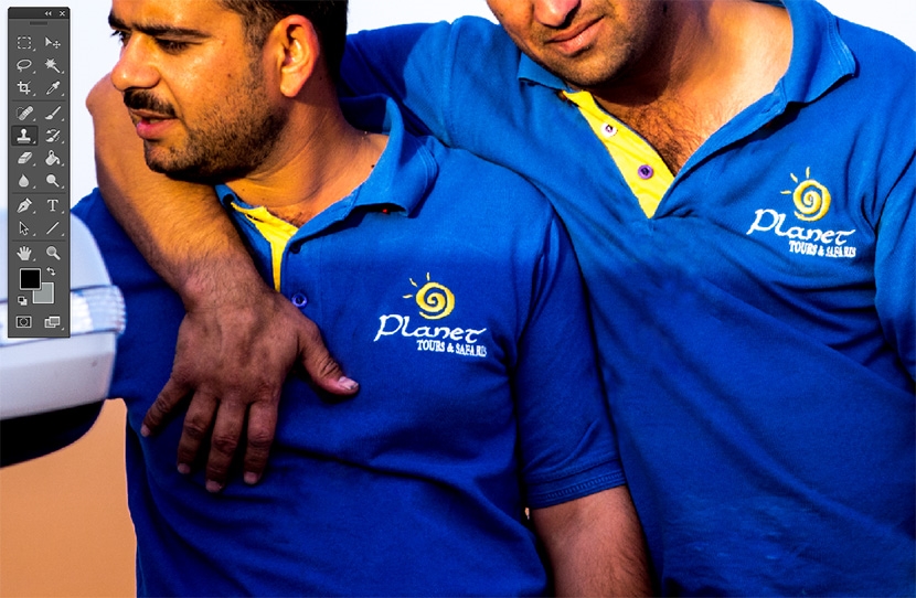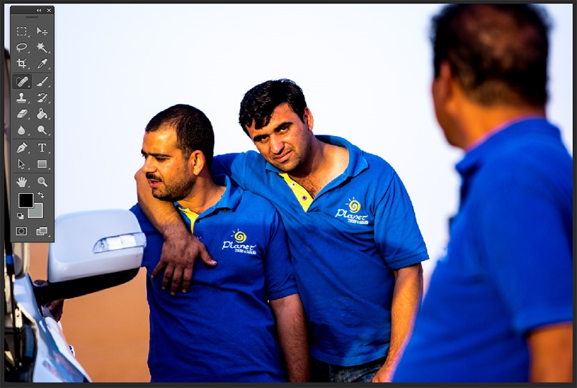 例如上图,我希望移除两人戴着的证件,所以用污点修复画笔工具(见工具列) 几笔就迅速地抹掉,如下图,做得很随意,只用了10秒,效果尚可接受。